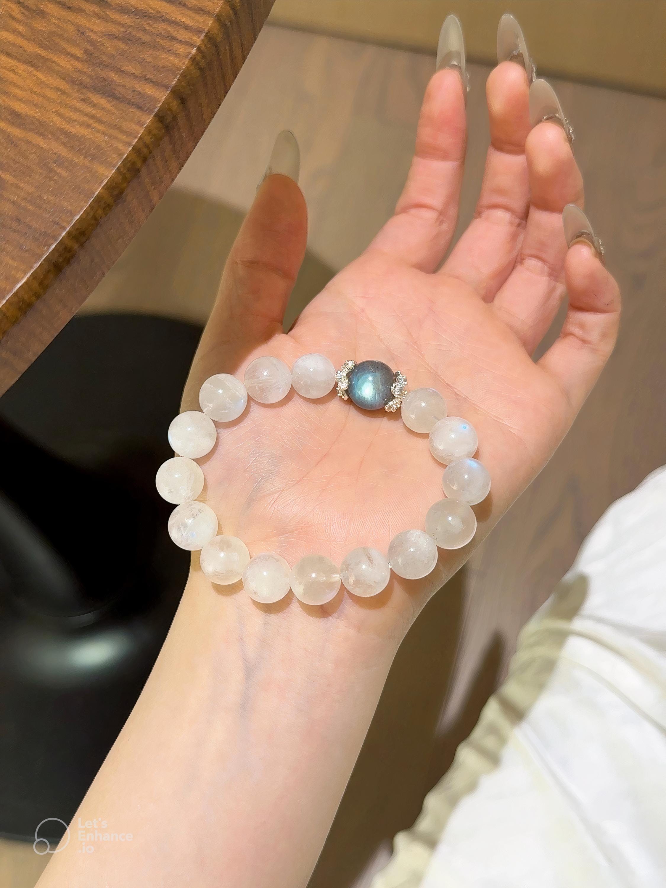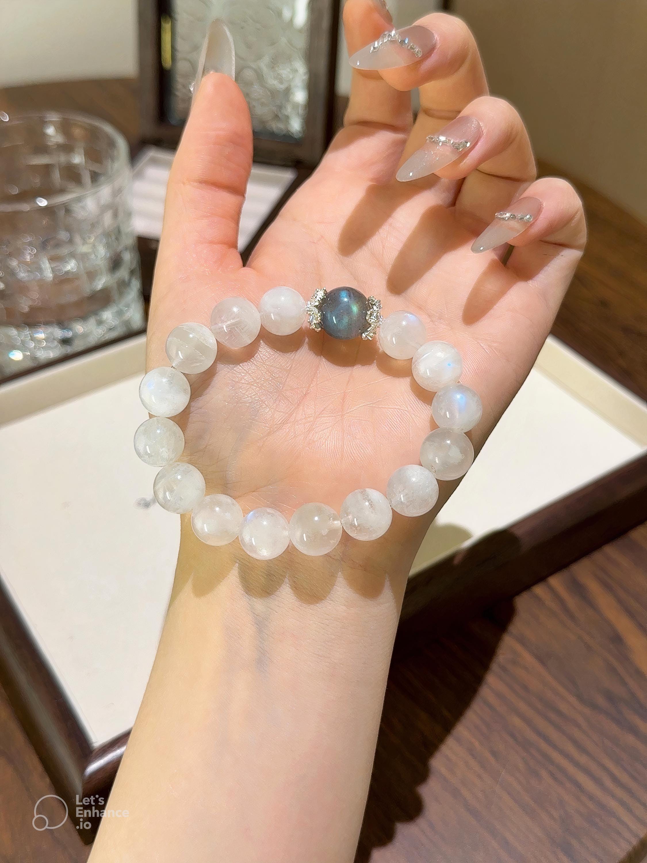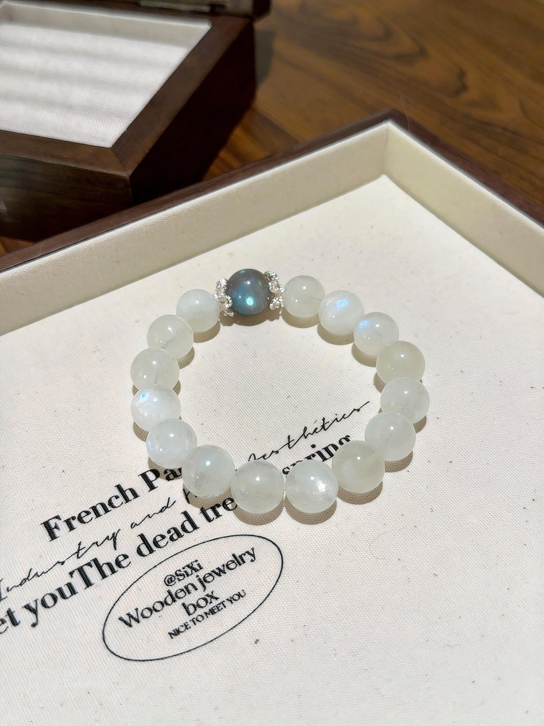 This luminous bracelet features soft, iridescent moonstone beads paired with a bold labradorite centerpiece — a powerful combination for emotional harmony and mental strength.