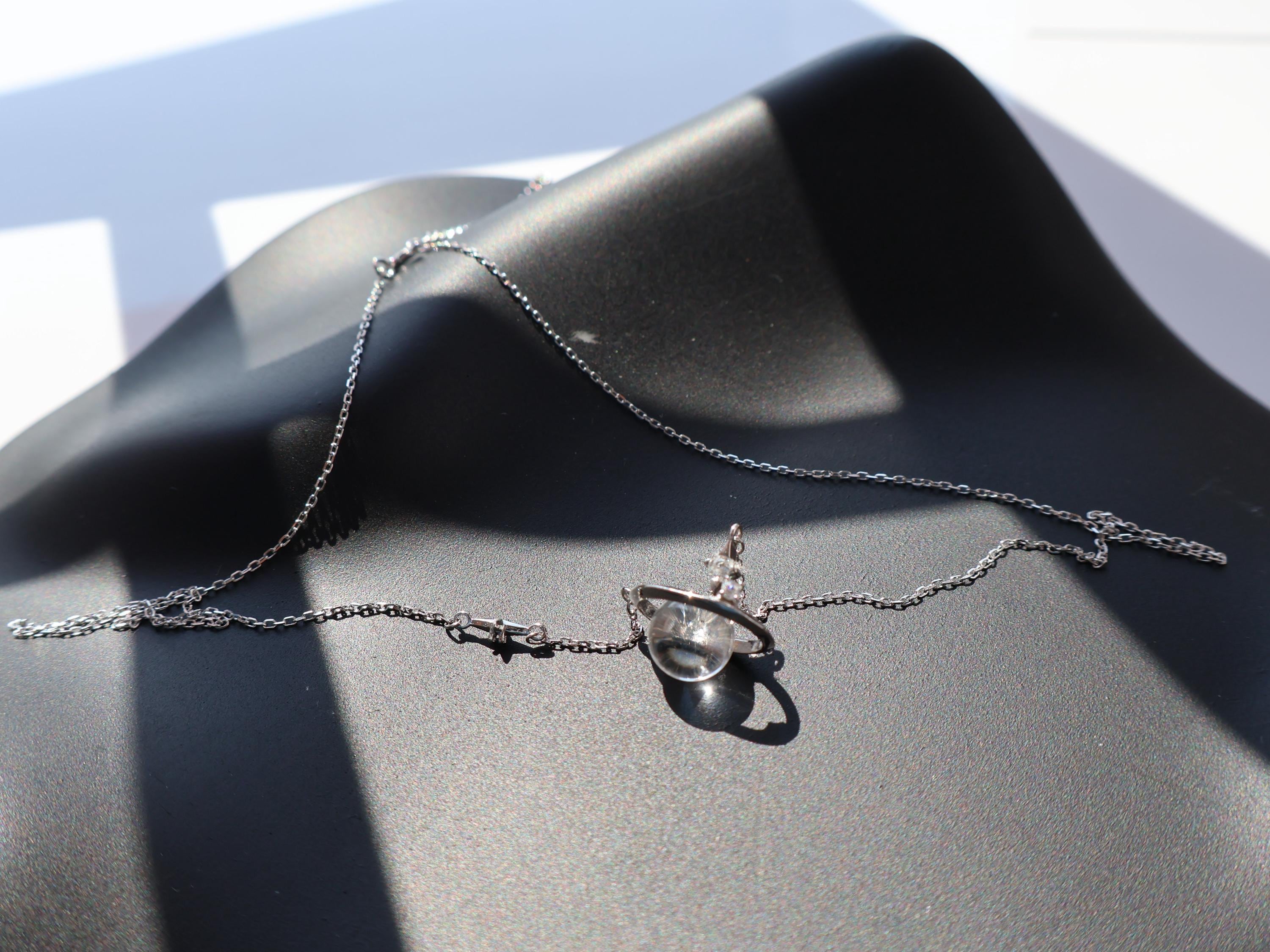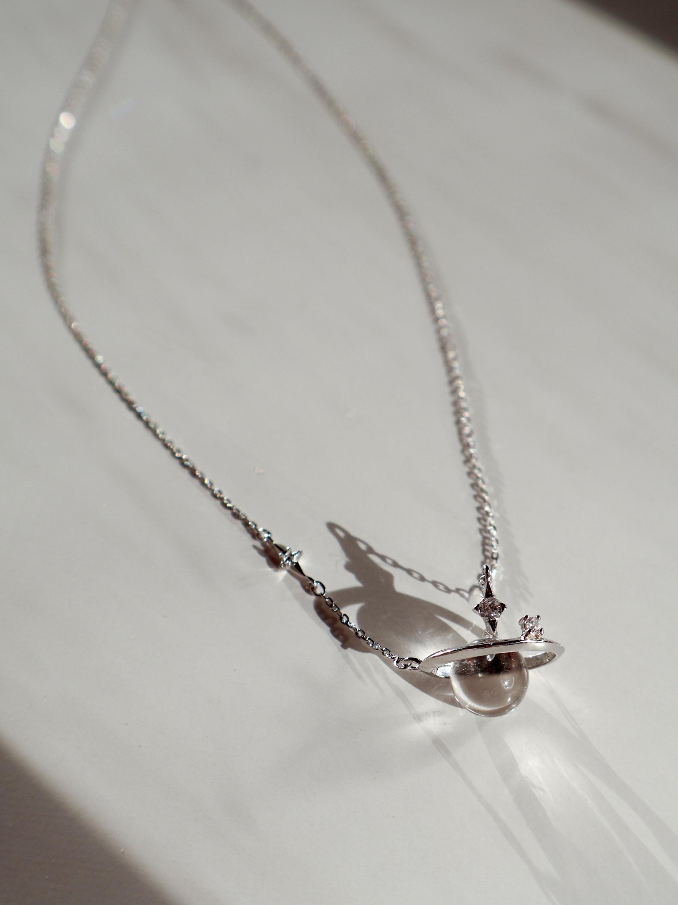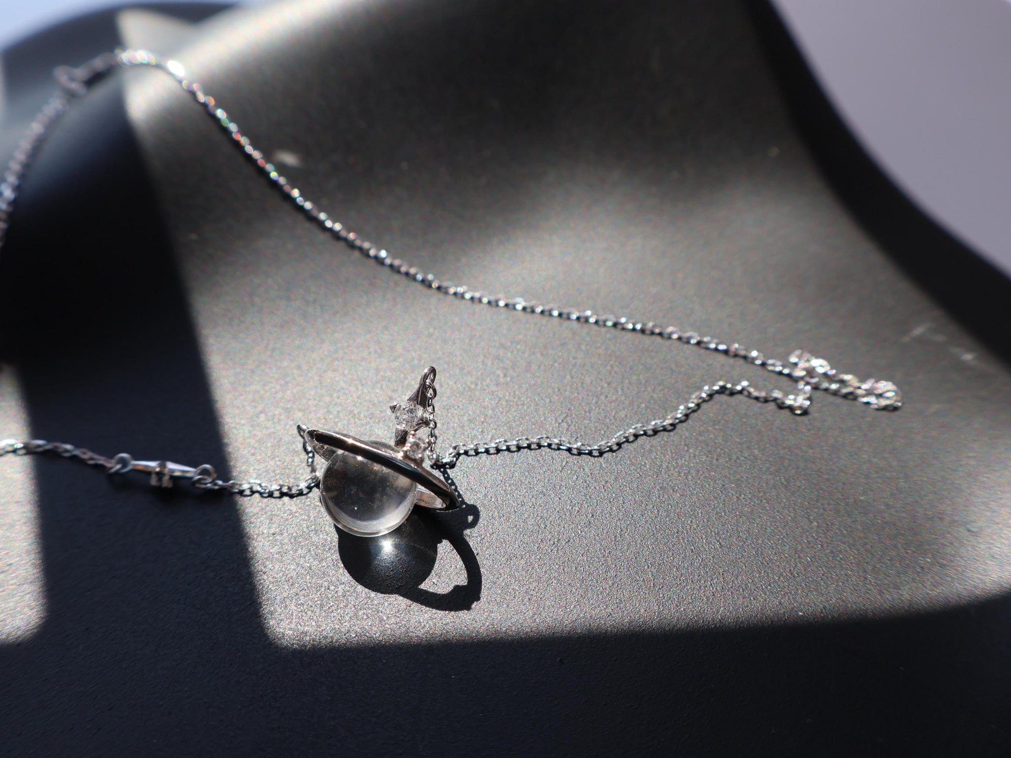 Saturn Clear Quartz Necklace Sterling Silver Planet Pendant with Crystal Orb, Celestial Jewelry