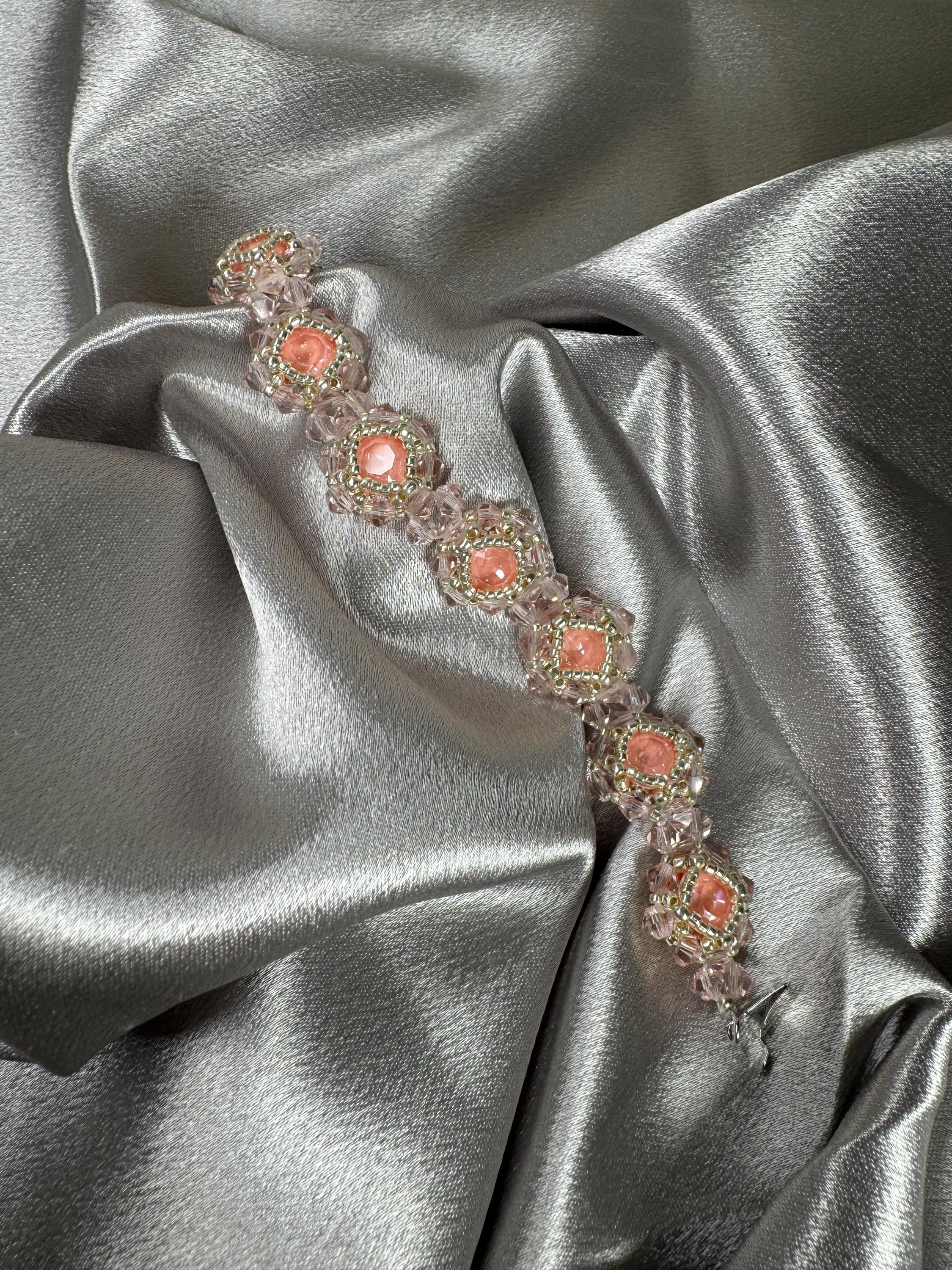 🌟Bracelet K is like a garden of tiny treasures, with each peachy-pink bead nestled in a sparkling, petal-like frame. The intricate design and glistening details make it feel as if little blooms are dancing along your wrist. 🌷💫