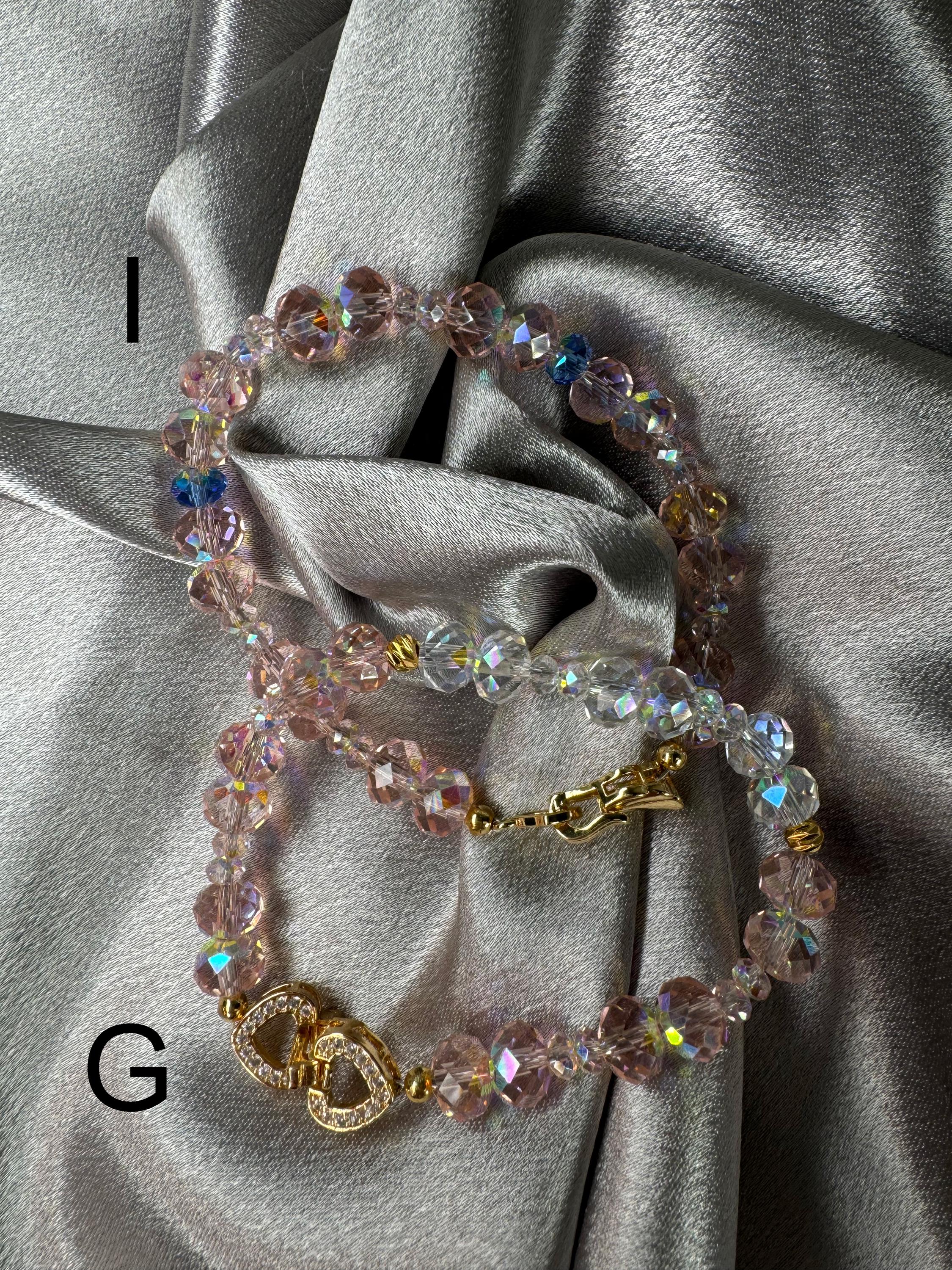 🌟Bracelets G and I are both made of sparkly, faceted beads that catch the light beautifully, shining with hints of rainbow colors. Bracelet G features a lovely golden double-heart charm, adding touch of sweetness and elegance. Perfect for adding a little sparkle to any outfit! ✨💖