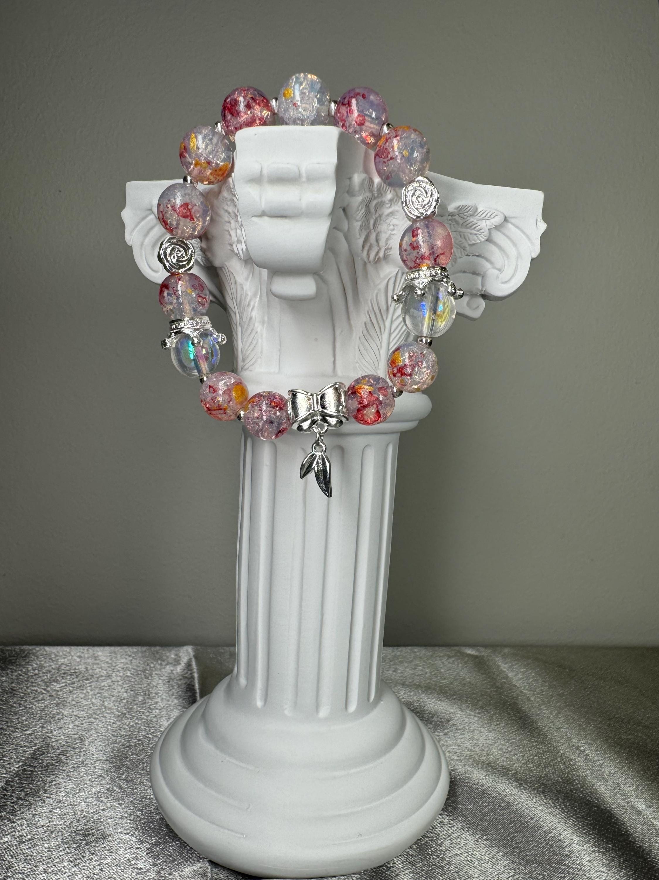 🌟Bracelet F sparkles with pink-speckled beads, each shining with hints of the rainbow under the light! Adorned with delicate silver rose spacers and a sweet bow charm with tiny leaf dangles, it feels like a touch of magic and elegance. Perfect for anyone who loves a bit of charm and whimsy on their wrist! 🌸🎀✨