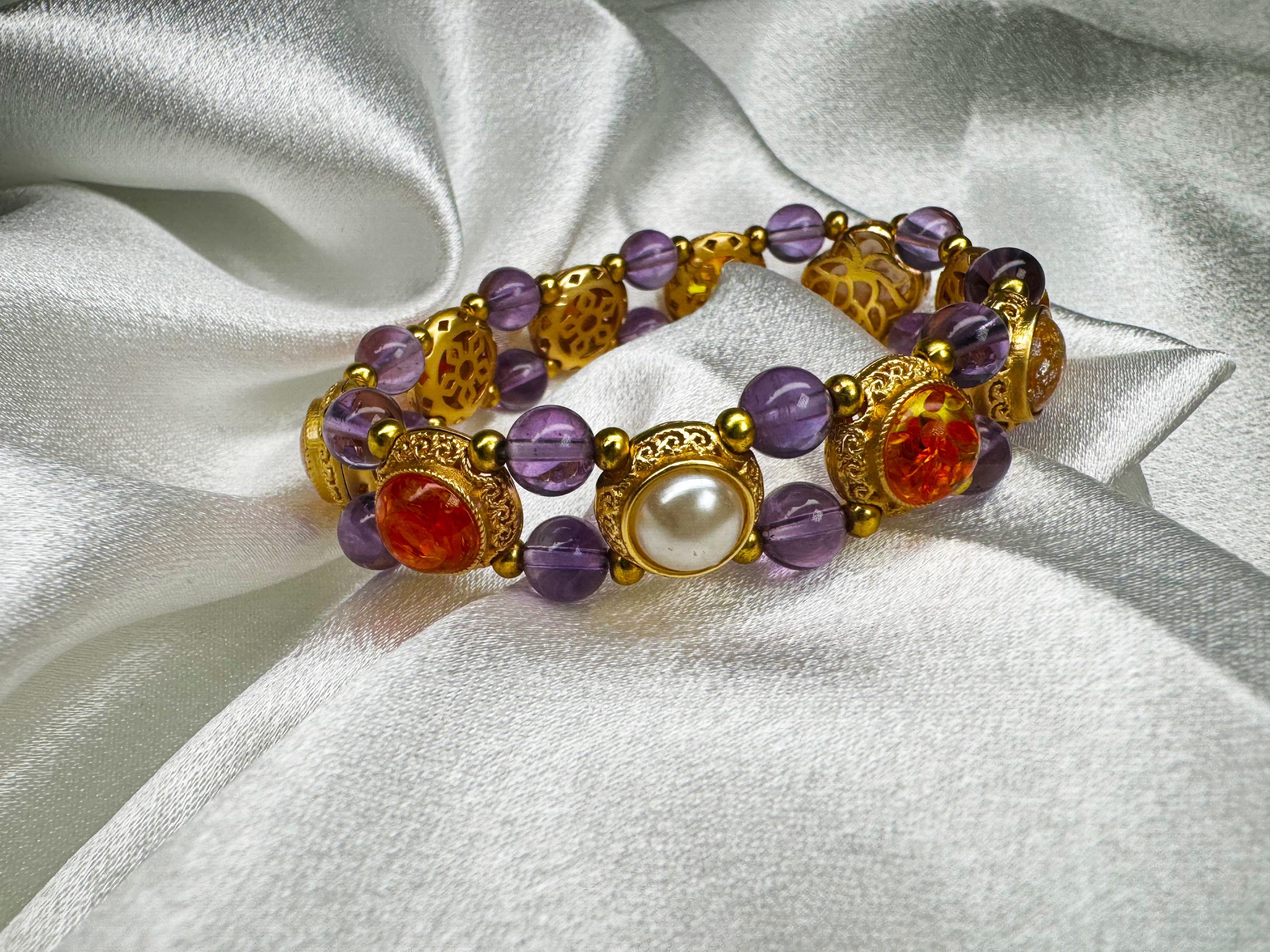 🌟Bracelet A is a royal-inspired double-layered beauty 👑✨, with lots of golden details that give it a touch of luxury. The 8mm purple beads add a cute splash of color 💜, while the center features pearls and amber-like elements for a stylish, elegant vibe ✨. Perfect for adding a bit of charm and sophistication to your look!