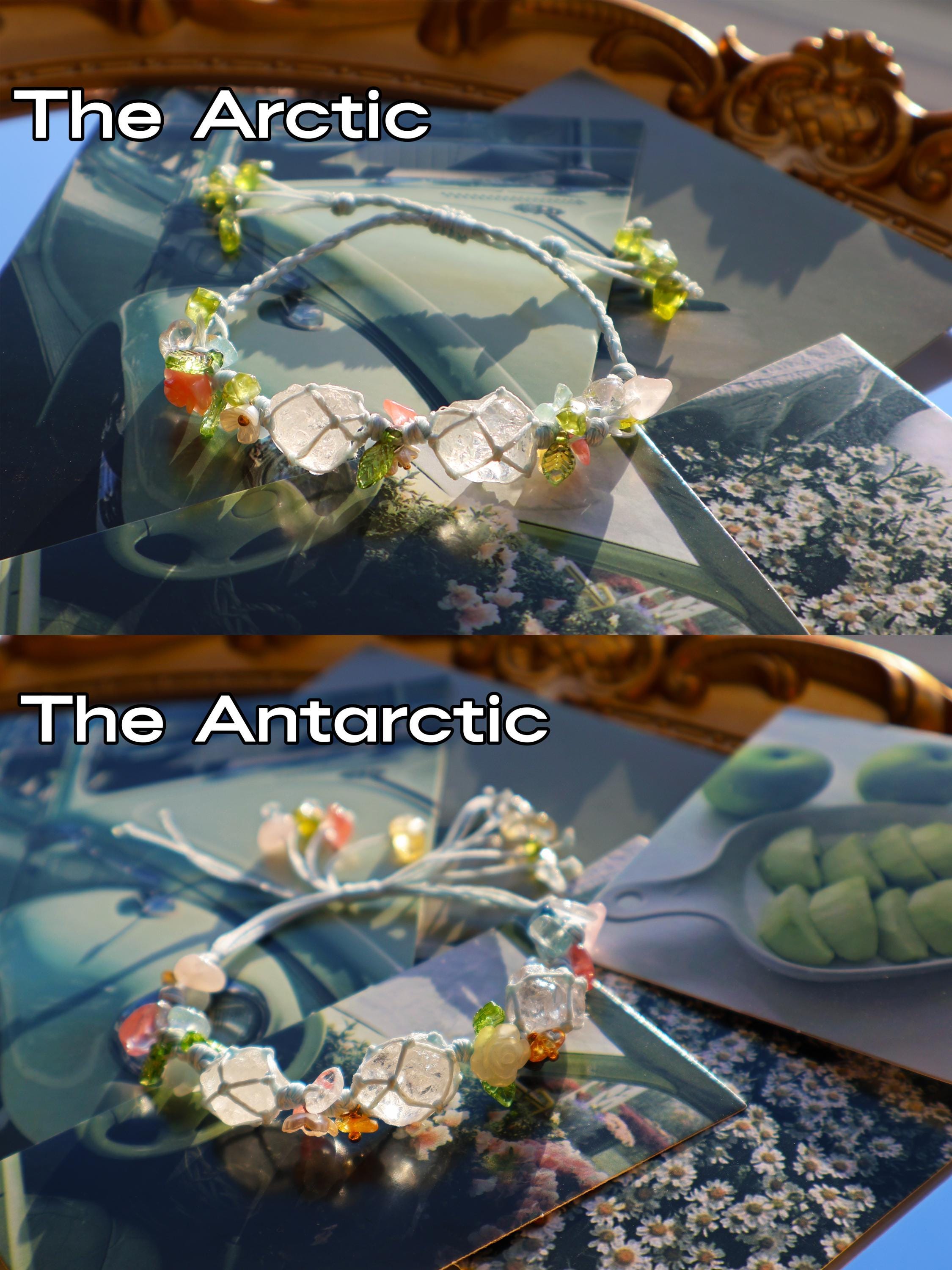 💡 Design idea: This bracelet draws inspiration from the icy landscapes and delicate beauty of the Antarctic. The design features clear quartz stones paired with soft floral accents, symbolizing purity and the untouched essence of nature. Its bright and refreshing tones evoke the feeling of exploring frosty, glistening terrains.